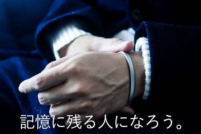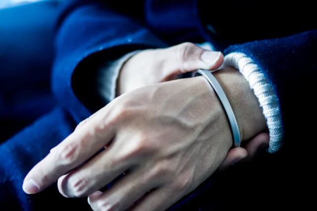手首の細い方にバングルをグッと通し、くるっと90度回せばOK。